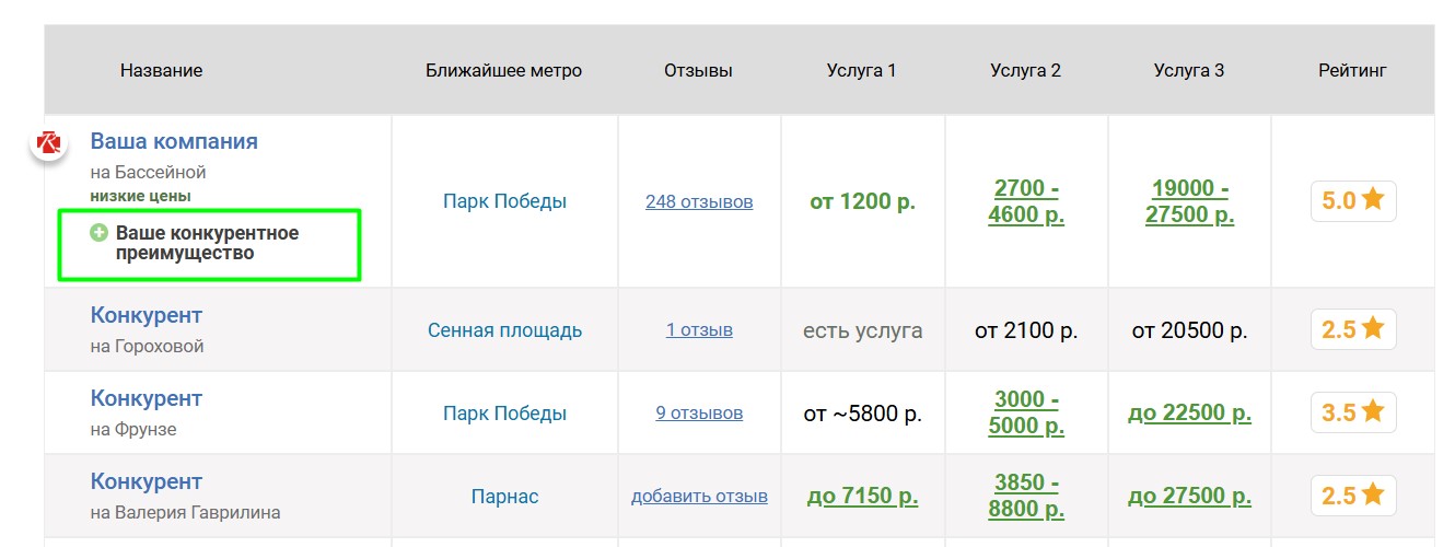 Если компания имеет конкурентные преимущества, мы можем их опубликовать на странице ателье и показывать в таблицах в соответствующих страницах. Преимущества можно гибко настраивать для разных услуг. Правильная публикация преимуществ существенно увеличивает интерес клиентов, так как выделяет ателье в таблицах и показывает, почему следует обратиться именно туда.