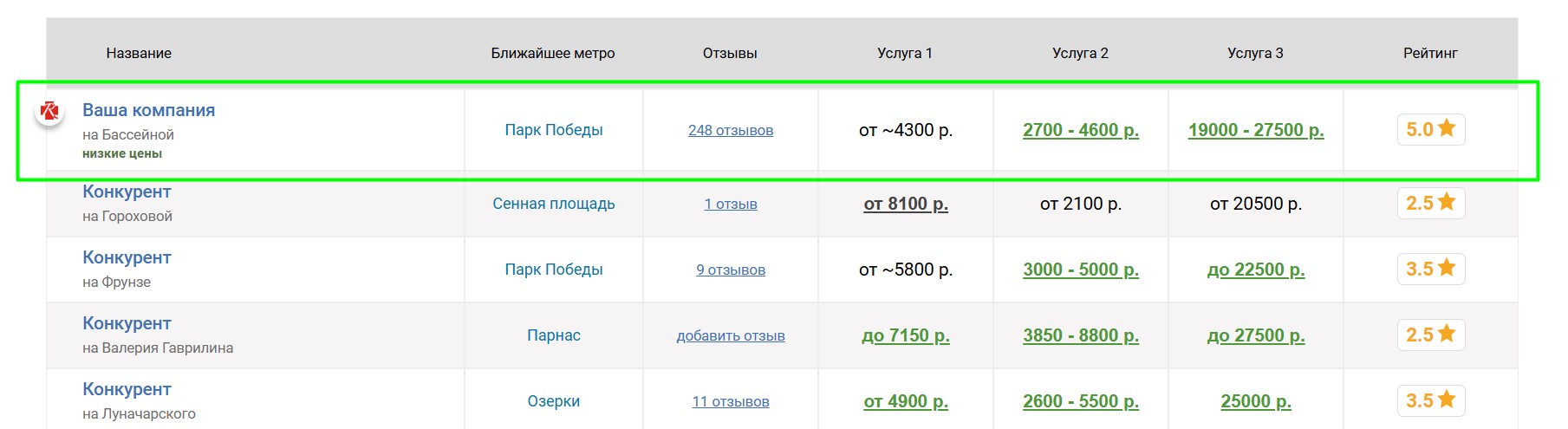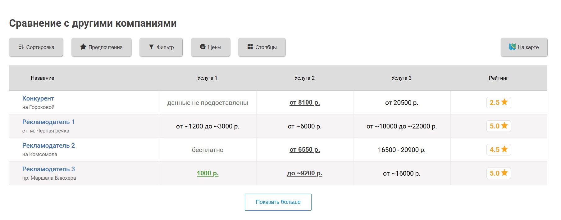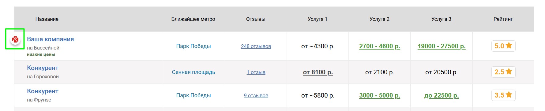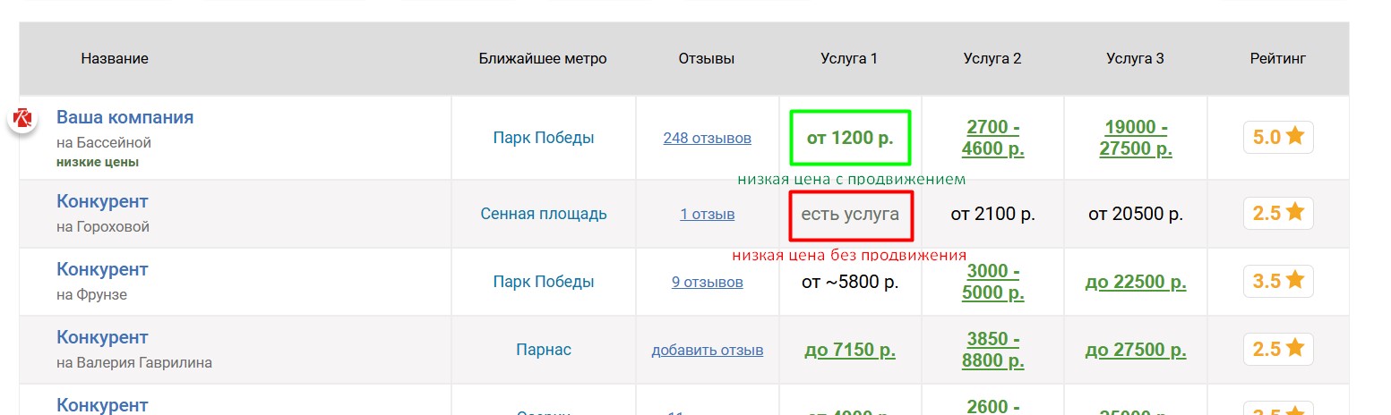 Вокруг продвигаемого таким образом ателье выбирается некоторое количество ближайших конкурирующих ателье, продвигаемое ателье попадёт к ним в таблицу «Сравнение по ценам», которая выглядит следующим образом:
